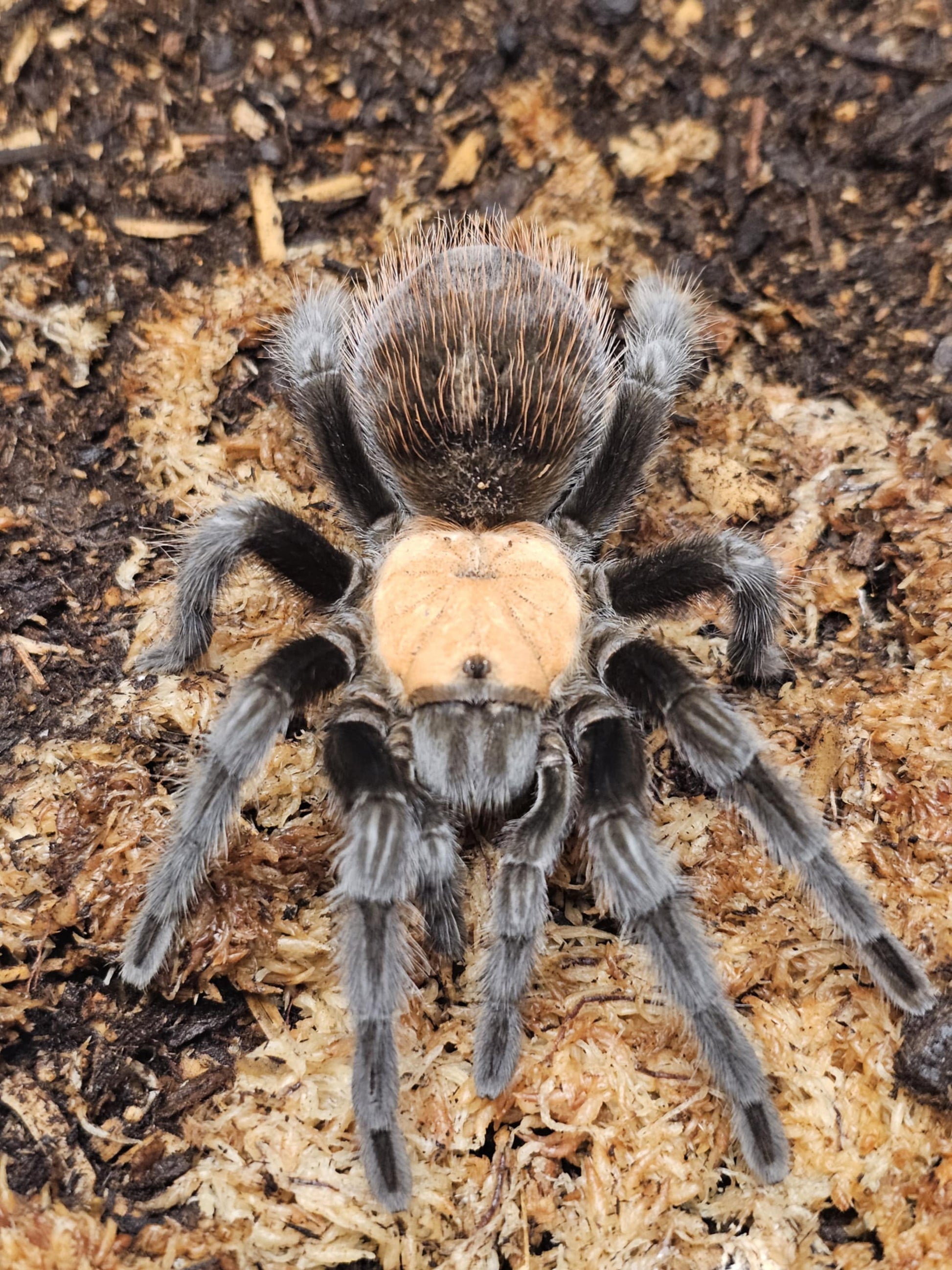 Appearance: A striking tarantula with a jet-black body, deep red hairs on the abdomen, and a contrasting golden-blonde carapace. This bold color combination makes it highly sought after in the hobby.